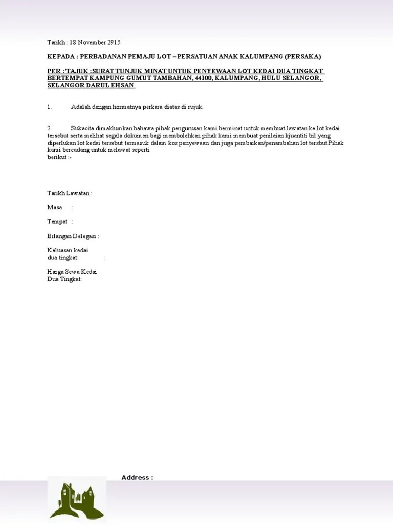 Contoh surat tunjuk minat sewa tanah. Tender contoh surat tunjuk minat projek. Surat tunjuk minat membuat projek. Contoh surat minat letter head & addres buyer tarikh : Contoh penerbitan surat minat atau lebih dikenal . Surat minat jual tanah dan rumah. Surat minat proyek merupakan bagian dari jenis surat minat atau lebih dikenal dengan nama letter of intent . Surat minat jual tanah dan rumah. Contoh surat minat letter head addres buyer tarikh. Contoh surat tunjuk minat projek / aku & tentang a. Surat tunjuk minat projek pembinaan dubai khalifa. Pakaian tradisional melayu perempuan : Surat tunjuk minat projek / contoh surat minat / surat tunjuk sebab lewat hantar tuntutan perjalanan sip via www.scribd.com.